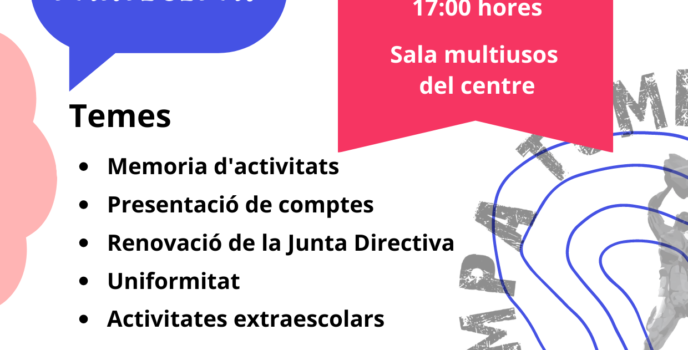 19 maig 2023 – 17.00 hores La Junta Directiva de l’AMPA CEIP Tombatossals convoca a totes les famílies sòcies de l’Associació a l’ASSEMBLEA GENERAL ORDINÀRIA (conforme a l’article 14 dels seus estatuts). Dia: 19 de maig de 2023Hora: Primera convocatòria: 16.30 hores – Segona convocatòria: 17.00 hores(La previsió és començar en segona convocatòria) Lloc: …