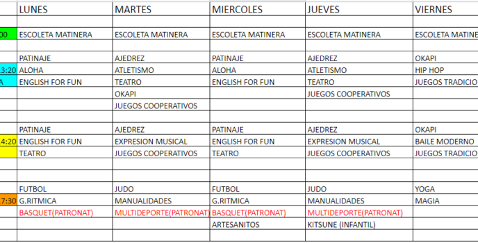 Els contactes de les empreses que realizten les extraescolars son:ACTIVALIA: aperez@grupactivalia.comSAGALS ( OKAPI): sagals@sagals.esJUEGOS COOPERATIVOS: sheilagarrido@fisiopediatrica.es Aquest llistat d’activitats no és definitiu, és necessari un nombre mínim d’alumnes perquè l’activitat tire endavant. Sabrem si es fa o no quan s’acaben les inscripcions i us ho comunicarem per correu electrònic. Assegureu-vos de que poseu bé les …