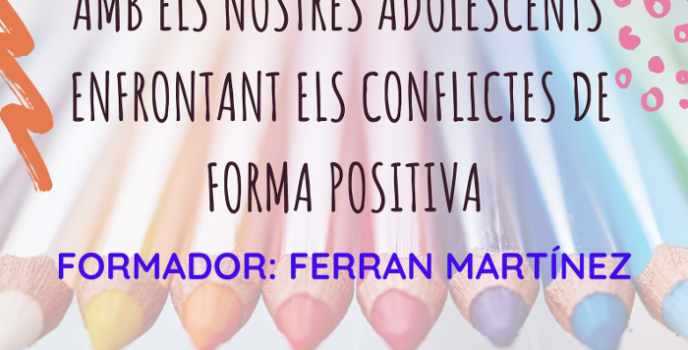 Després d’escoltar les vostres preferències, tenim el plaer de convidar-vos a la primera xerrada de l’escola de Mares i Pares. Us agraïm la vostra col·laboració, ja que ha segut molt important i us esperem a totes i tots la propera setmana. XERRADA: COM GESTIONAR LA RELACIÓ AMB ELS NOSTRES ADOLESCENTS ENFRONTANT ELS CONFLICTES DE FORMA POSITIVA DIMECRES …