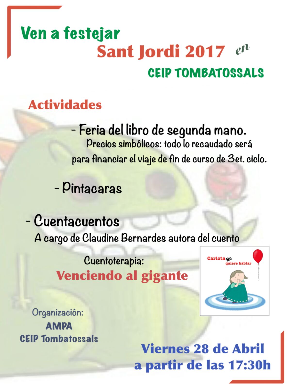 Sant Jordi 2017 en CEIP Tombatossals el viernes 28 de Abril a partir de las 17:30h. Actividades: Feria del libro de segunda mano. Pintacaras. Cuentacuentos. Cuentoterapia: Venciendo al Gigante.